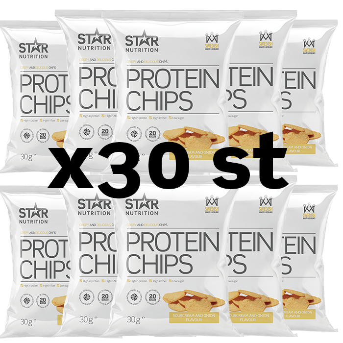 30 x Star Nutrition Protein Chips! Star Nutrition Protein Chips är precis vad det låter som: Chips med protein. 45% fullvärdigt protein, 18% fiber och under 120 kcal per påse.