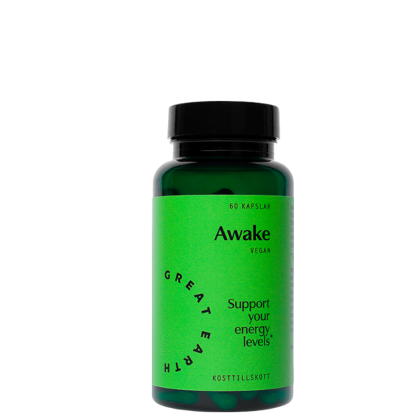 Awake är ett kosttillskott från Great Earth med rysk rot, ginseng och rosenrot. Även med B5 och B12 som bidrar till att minska trötthet och utmattning.