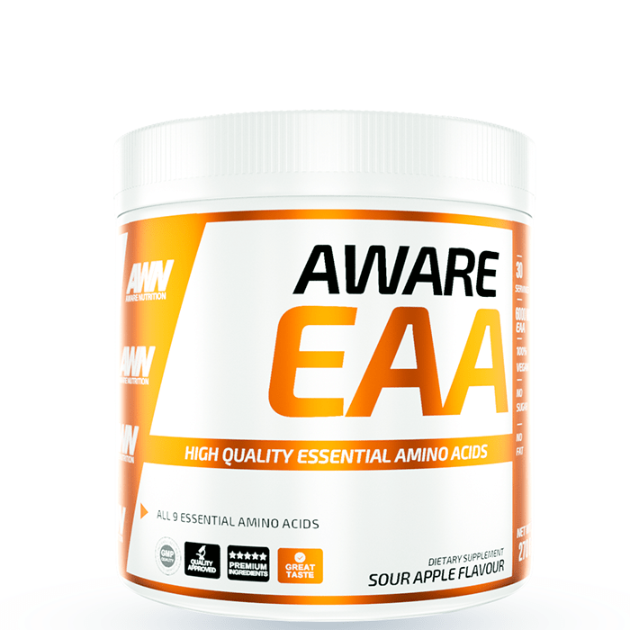 Aware EAA 330 g är ett kosttillskott från Aware. Med 7 600 mg EAA per skopa. Löser sig lätt i vatten och smakar riktigt bra.
