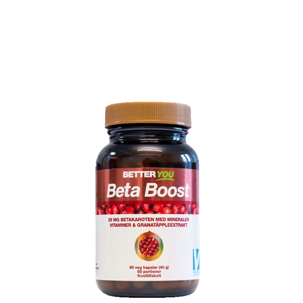 Beta Boost är ett kosttillskott från Better You. Detta är ett noga sammansatt vitamin- & mineral komplex med bland annat 25 mg betakaroten samt koppar för hudens normala pigmentering.
