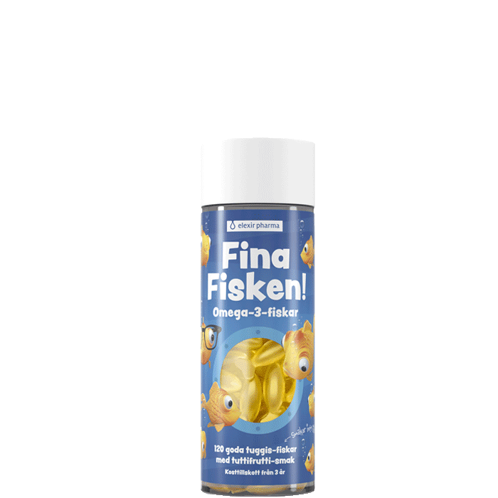 Fina Fisken är ett kosttillskott från Elexir Pharma med omega-3 i form av tuggisar med smak av tuttifrutti.
