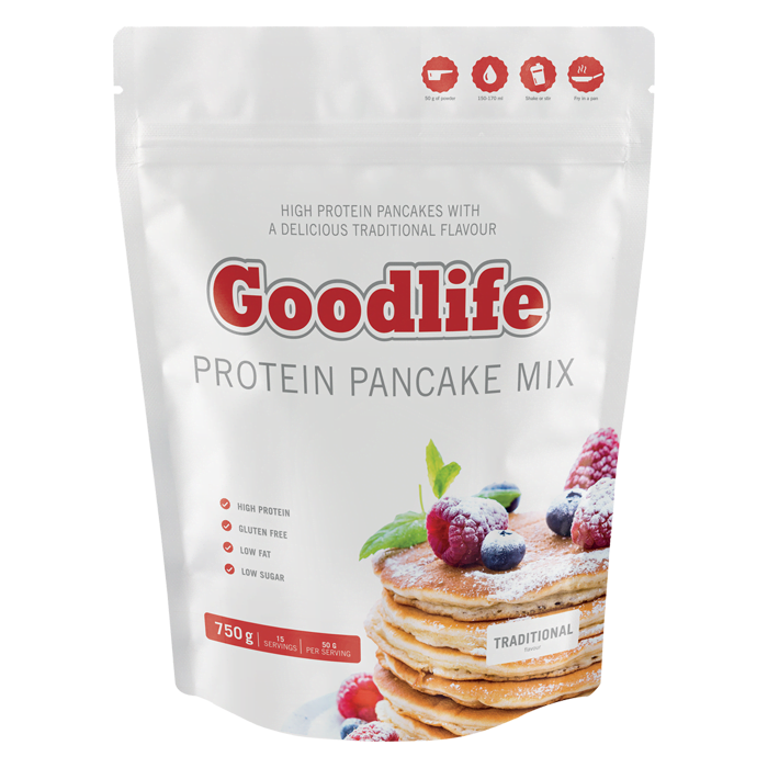 Goodlife Protein Pancakes är glutenfria, nyttiga och smakrika pannkakor med ett högt proteininnehåll och ett lågt sockerinnehåll.