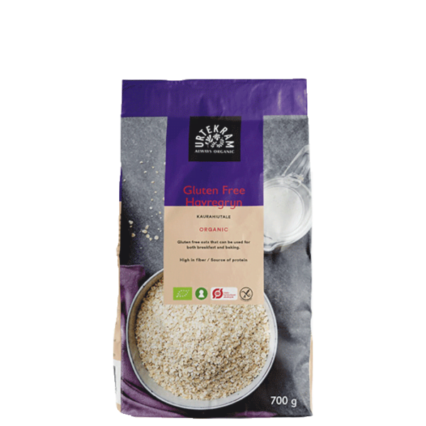 Glutenfria havregryn från Urtekram innehåller ekologiska havregryn som har behandlats med omsorg för att kunna kallas glutenfria. Med ett högt fiberinnehåll!