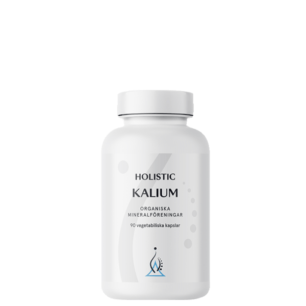 Holistics kapslar med kalium. Kalium finns bland annat i frukter, grönsaker, nötter, frön, mjölkprodukter och kött. Kalium bidrar till att bibehålla normalt blodtryck.