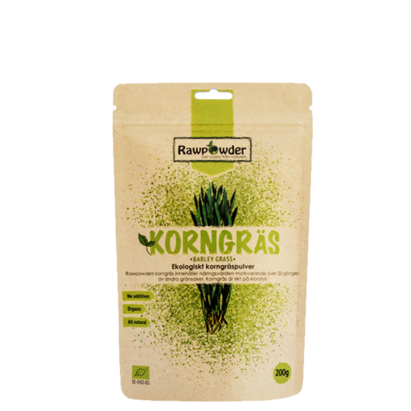 Korngräs EKO är ett pulver av 100 % ekologiskt korngräs som kan blandas med vatten, smoothies eller användas i mat.