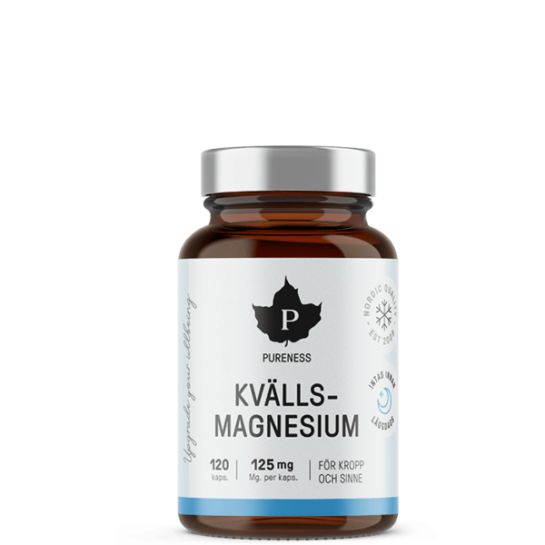 Kvällmagnesium är ett kosttillskott från Pureness med magnesium, teanin och kamomill. Används på kvällen i samband med sänggående. Förpackningen räcker i upp till 120 dagar.