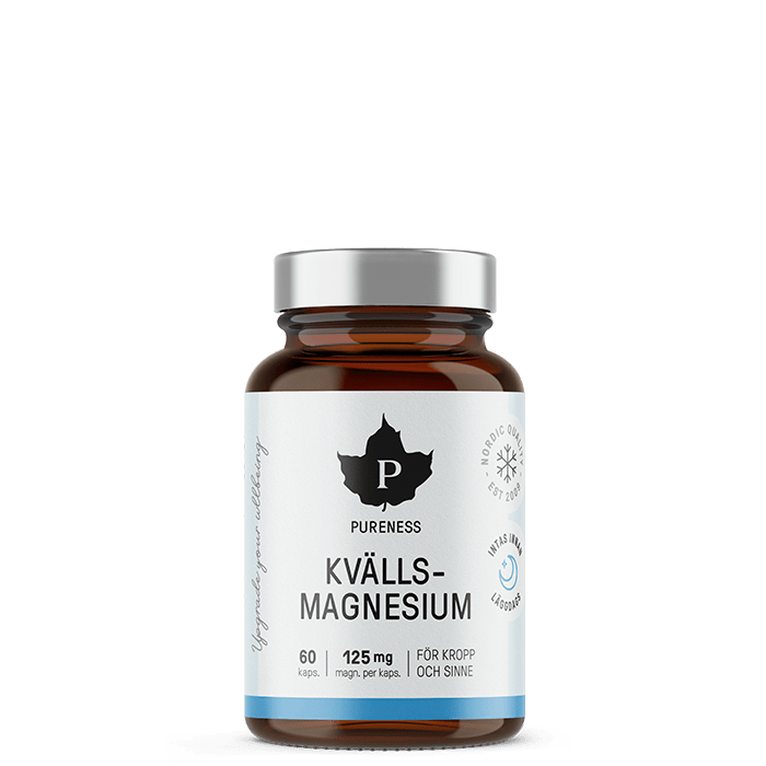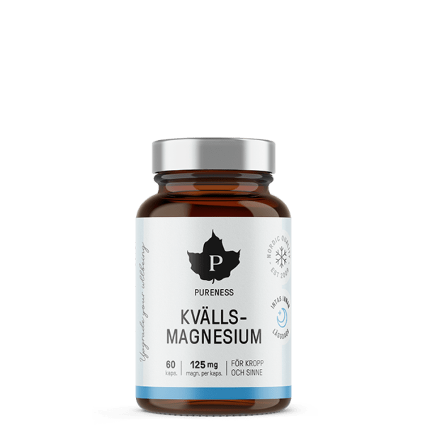 Kvällmagnesium är ett kosttillskott från Pureness med magnesium, teanin och kamomill. Används på kvällen i samband med sänggående. Förpackningen räcker i upp till 60 dagar.