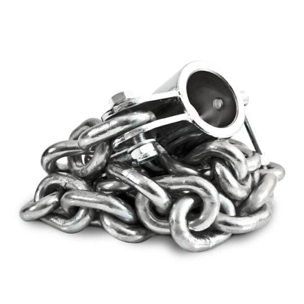 Lyftkedjor från Master Fitness som är zinkpläterade med förkromade hållare för 50 mm skivstång med tre olika vikter.