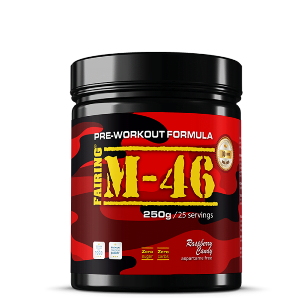 M-46 är en högkoncentrerad PWO i pulverform från Fairing. Detta kosttillskott innehåller bland annat koffein, spenatextrakt (spinox) och kreatinmalat.