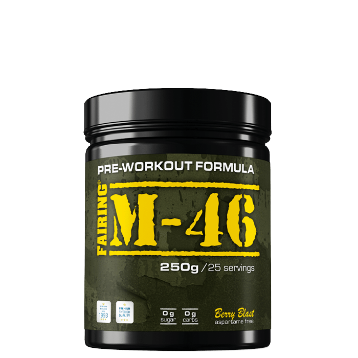 M-46 är en högkoncentrerad PWO i pulverform från Fairing. Detta kosttillskott innehåller bland annat koffein, spenatextrakt (spinox) och kreatinmalat.