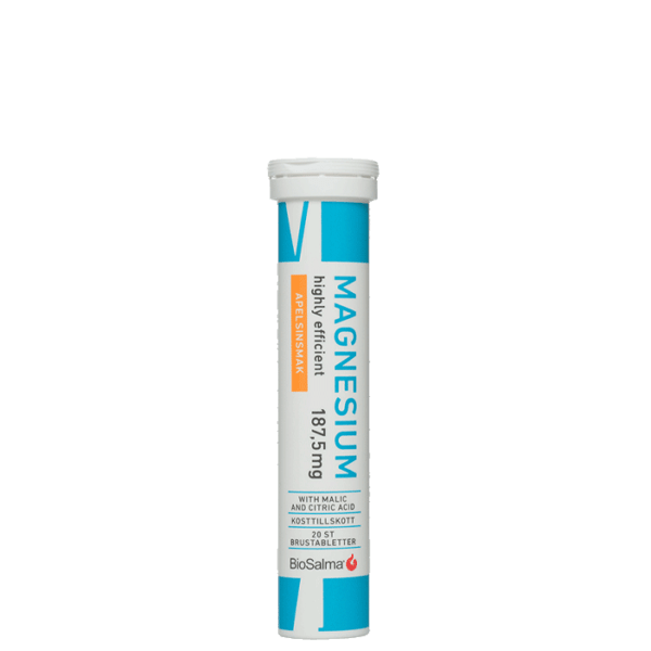 Magnesium 187,5mg är ett kosttillskott från BioSalma. Magnesium i form av smidiga brustabletter med härlig smak av apelsin. Perfekt för dig som inte vill ha kapslar eller vanliga tabletter.