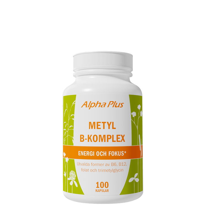 Metyl-B-Komplex är ett kosttillskott från Alpha Plus sokm innehåller ett komplett spektrum av B-vitaminer i kombination med PABA, kolin, inositol och betain.