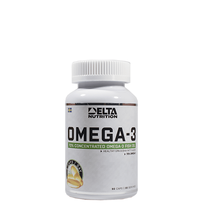 Omega-3 från Delta Nutrition är ett kosttillskott med naturligt fiskoljekoncentrat där varje kapsel innehåller 70 % omega-3.