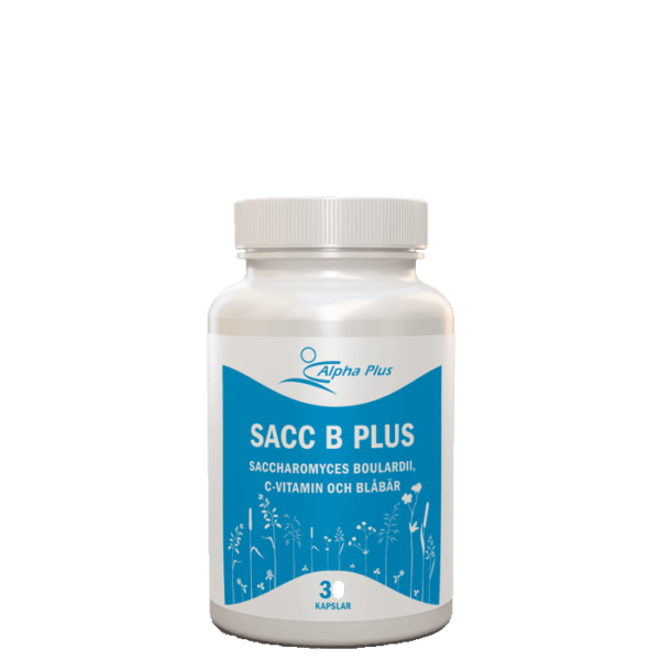 Sacc B Plus är ett kosttillskott från Alpha Plus som kombinerar jästbakterien Saccharomyces boulardii med vitamin C och finska blåbär.
