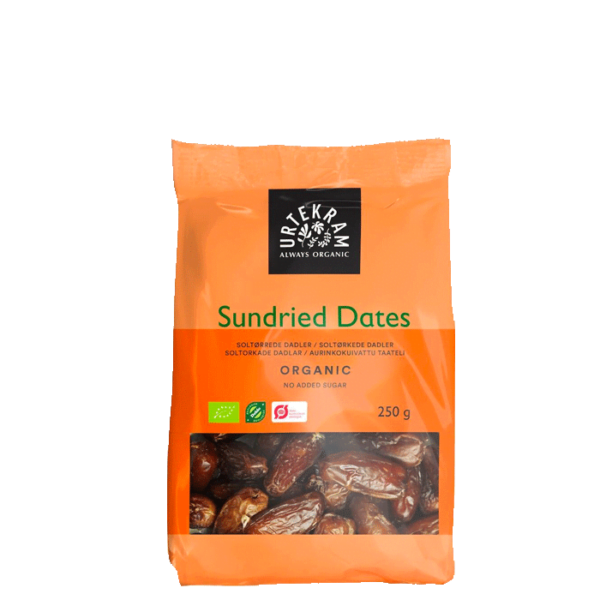 Soltorkade dadlar från Urtekram är ekologiska, soltorkade dadlar som är skonsamt rehydrerade för bevarad saftighet. Goda som snacks eller blandade i müsli.