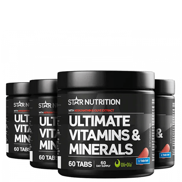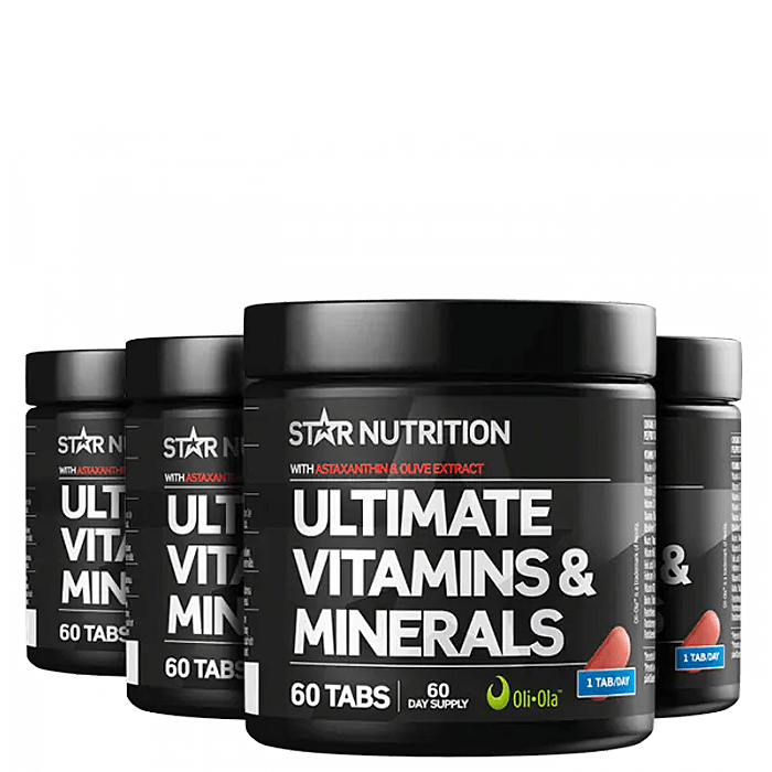4 x Ultimate Vitamins & Minerals från Star Nutrition är en multivitamintablett som inkluderar antioxidanterna vitamin-A, -E, -C och Selen. Balanserat vitamin- och mineralkomplex.