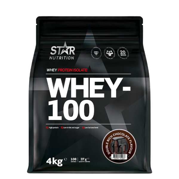 Whey-100 från Star Nutrition har nära ett 100 %-igt proteininnehåll och används i samband med träning för att öka eller bibehålla muskelmassan.