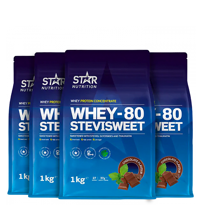 4 x Whey-80 Stevia, 1 kg: Nordens mest sålda proteinpulver Whey-80 finns nu i en version som är sötad med naturliga glykosoider från växten stevia!